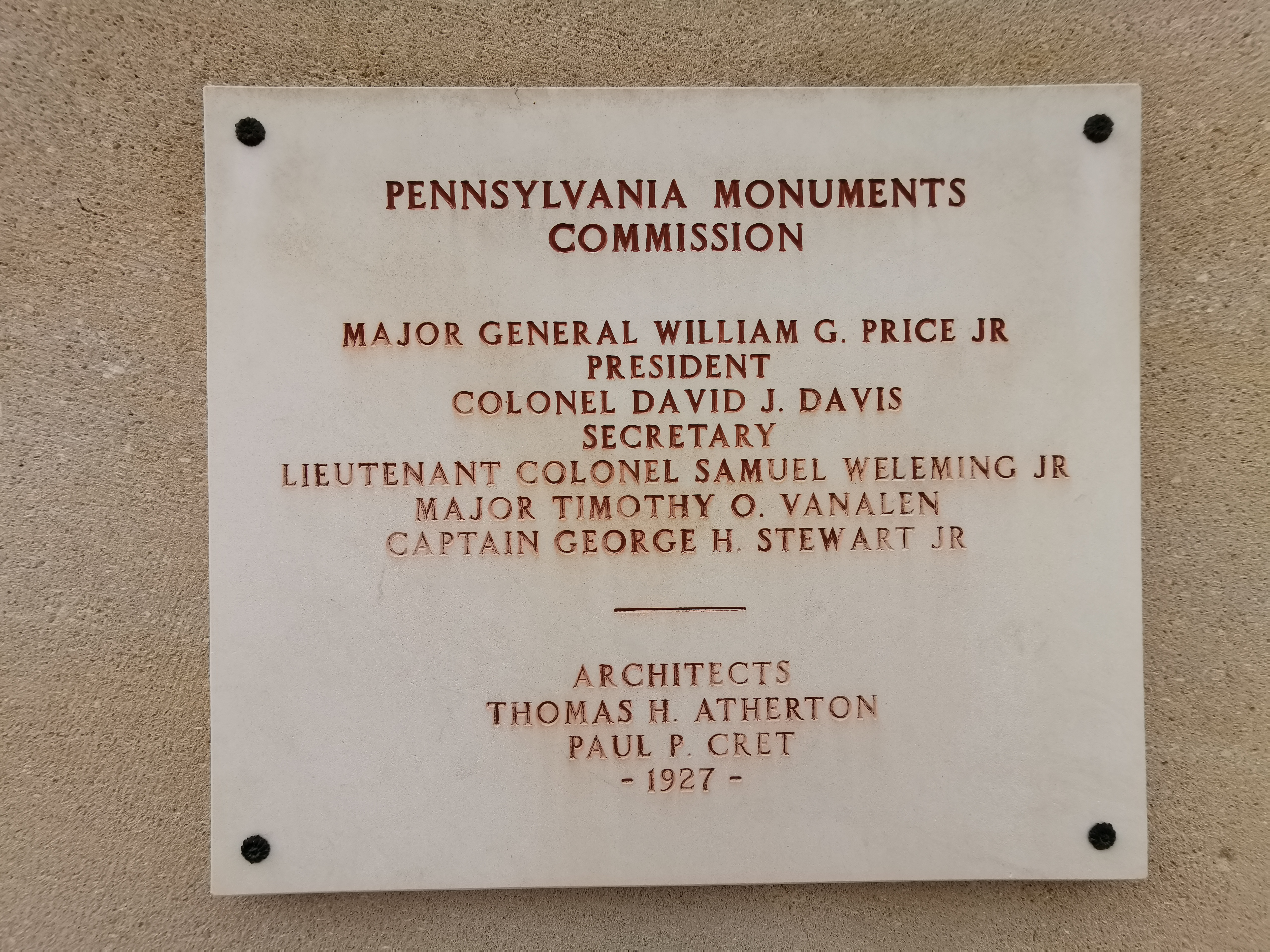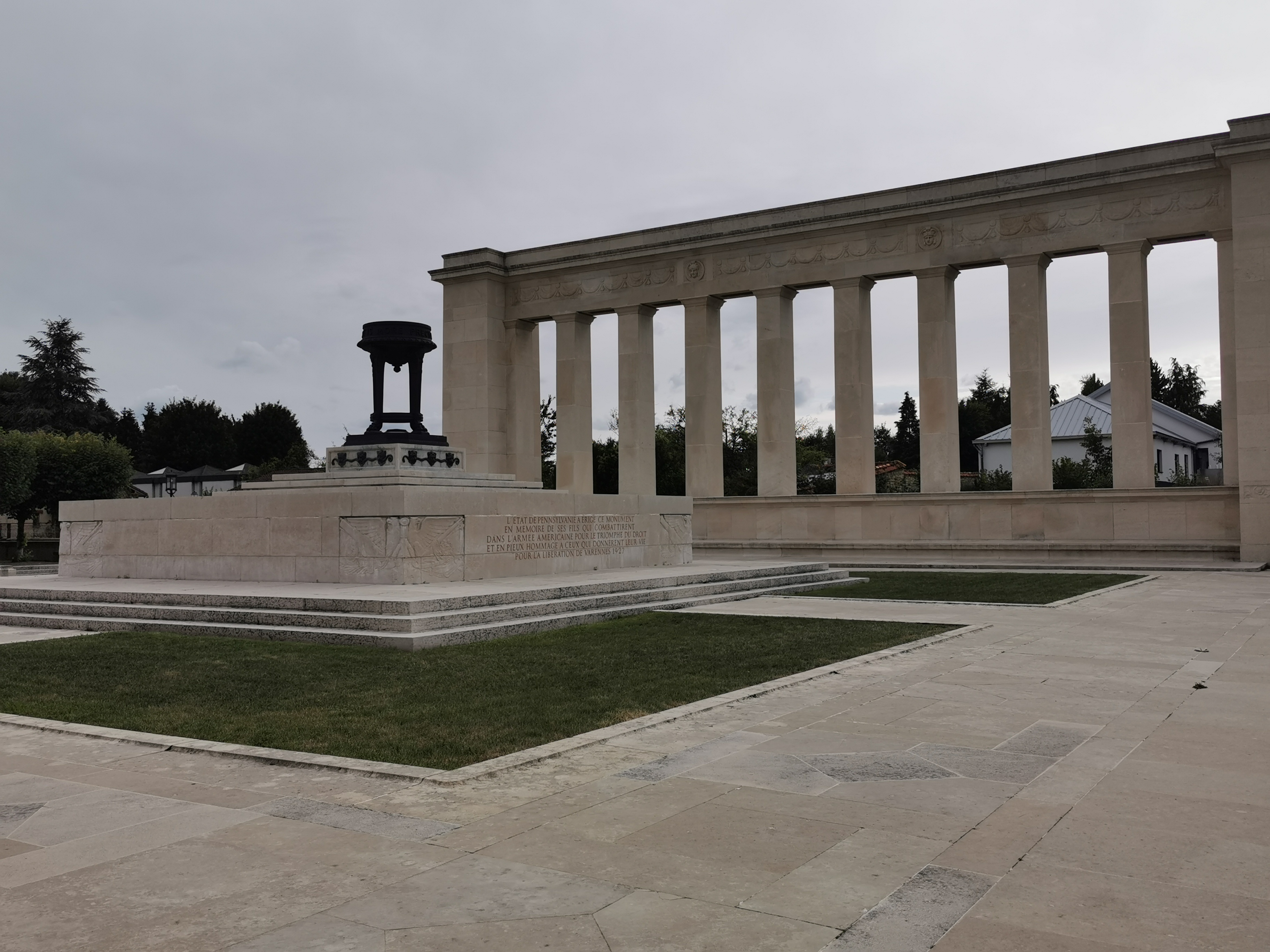 Lieu de recueil Sur le piédestal, un texte gravé en français et en anglais rappelle les raisons de sa construction par l'Etat américain : « L'état de Pennsylvanie a érigé ce monument en mémoire de ses fils qui combattirent dans l'armée américaine pour le triomphe du droit et en pieux hommage à ceux qui donnèrent leur vie pour la libération de Varennes - 1927 ».